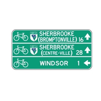 Le panneau « Direction et acheminement d’une voie cyclable» (I-95) indique le nom d’une voie cyclable ou d’une destination pour les cyclistes, la direction et la distance à parcourir.