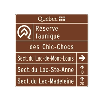 Le panneau d’entrée d’un secteur et d’acheminement de deux secteurs « Réserve faunique » (I-460-8) indique la présence d’une réserve faunique qui a un statut de territoire faunique