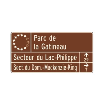 Le panneau d’acheminement de deux secteurs « Parc du Canada » (I-490-7) indique la présence d’un parc fédéral géré par la Commission de la capitale nationale du Canada
