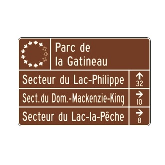Le panneau d’acheminement de trois secteurs « Parc du Canada » (I-490-8) indique la présence d’un parc fédéral géré par la Commission de la capitale nationale du Canada