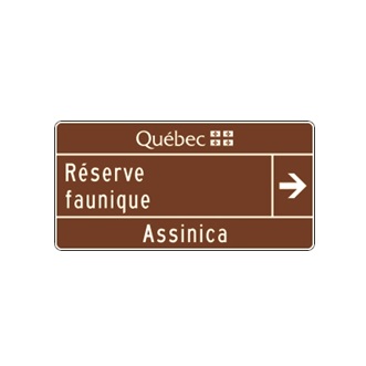 Le panneau « Réserve faunique exploitée par le ministère de l’Environnement, de la Lutte contre les changements climatiques, de la Faune et des Parcs » (I-460-12) indique l’entrée d’une réserve faunique qui a un statut de territoire faunique.