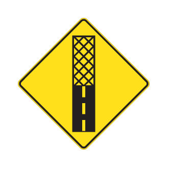 Le panneau « Changement de l’état d’une chaussée » (D-340) indique l’approche d’une chaussée rainurée ou, sur un pont, d’un tablier en treillis métallique ou en bois.