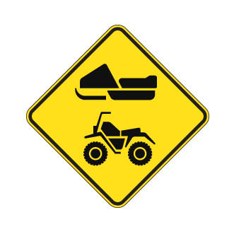 Les panneaux « Sentier de VHR désigné » (D-440-4) indiquent aux motoneigistes, aux motoquadistes et aux autres usagers qu’ils circulent sur un sentier de VHR désigné avec un autre type de véhicule.
