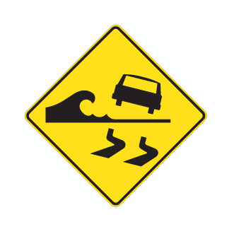 Les panneaux «Chaussée glissante» (D-310-3-G) indiquent que la chaussée risque d’être glissante à certains endroits. Il doit être installé aux abords d’une chaussée en bordure d’un cours d’eau, peut être rendue glissante lorsque mouillée par les embruns.