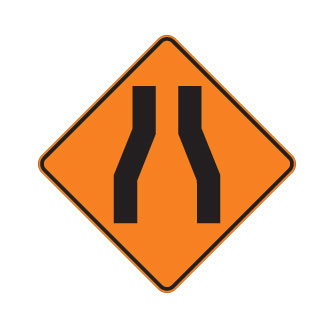 Le panneau « Chaussée rétrécie » (T-D-210-1) indique qu’il y a réduction de la largeur de la chaussée mais qu’il n’y a pas de réduction du nombre de voies de circulation.