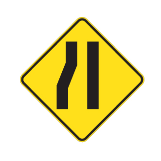 Le panneau « Chaussée rétrécie » (D-210-2-G) indique qu’il y a réduction de la largeur de la chaussée mais qu’il n’y a pas de réduction du nombre de voies de circulation. Le panneau D-210-2-G doit être utilisé pour indiquer un rétrécissement par la gauche