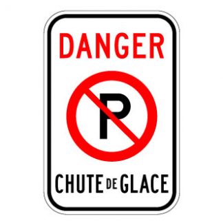 Ce panneau indique qu’il est interdit de stationner son véhicule en raison du risque de chute de glace à proximité.