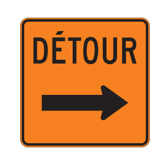 Le panneau « Détour » (T-90-2-D) indique la direction de l’itinéraire de détour prévu que doivent suivre les usagers de la route en raison des travaux.