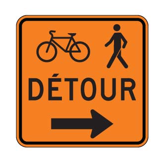 Le panneau « Détour pour piétons et cyclistes » (T-90-13-D) indique la direction du détour à suivre par les piétons et les cyclistes en raison de travaux.