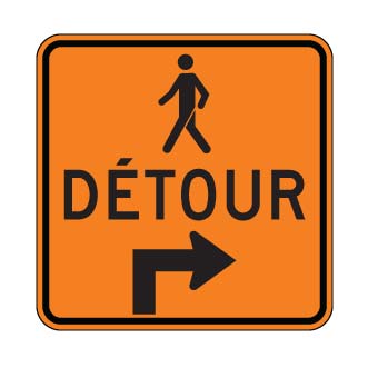 Le panneau « Détour pour piétons » (T-90-18-D) indique la direction du détour à suivre par les piétons en raison de travaux.