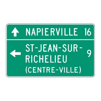 L’inscription « CENTRE-VILLE » peut être ajoutée à la suite du nom de la destination, s’il y a lieu. Elle est toujours écrite en majuscules, entre parenthèses, sous le nom de l’agglomération.