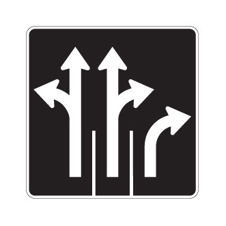 Le panneau « Direction des voies » (P-100-8-K) indique, pour les voies visées ce qui suit : Voie de gauche : aller tout droit ou tourner à gauche et voie centrale : aller tout droit ou tourner à droite et voie de droite : tourner à droite.