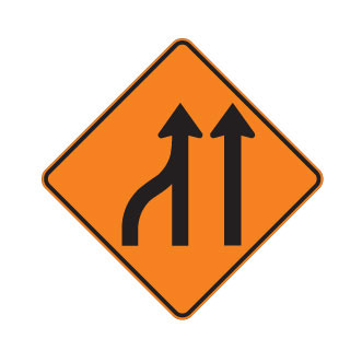 Le panneau « Fusion de voies » (T-100-2-D) indique, qu’une des voies de circulation est temporairement fermée en raison de travaux et qu’il y a lieu d’emprunter celles demeurées ouvertes à la circulation.
