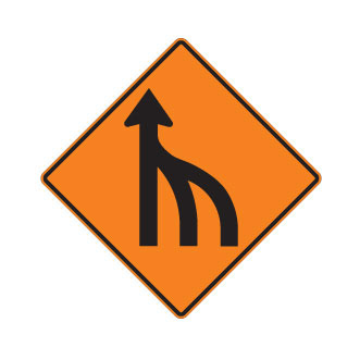 Le panneau « Fusion de voies » (T-100-3-G) indique, qu’une des voies de circulation est temporairement fermée en raison de travaux et qu’il y a lieu d’emprunter celles demeurées ouvertes à la circulation.