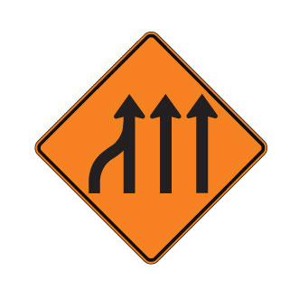 Le panneau « Fusion de voies » (T-100-4-D) indique, qu’une des voies de circulation est temporairement fermée en raison de travaux et qu’il y a lieu d’emprunter celles demeurées ouvertes à la circulation.