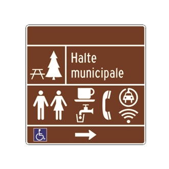 Le panneau « Halte routière » exploitée par une municipalité (I-420-6)indique l’entrée d’un endroit aménagé le long d’une route pour les automobilistes qui souhaitent se reposer.