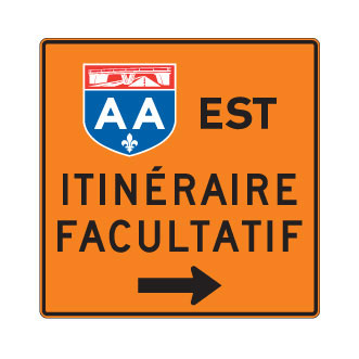 Les panneaux « Itinéraire facultatif » (T-95) indiquent, le cas échéant, l’itinéraire facultatif proposé aux usagers de la route en raison des risques de congestion occasionnés par des travaux en aval.