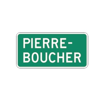 Le panonceau I-300-P-3 indique le nom de l’équipement. Il accompagne un panneau installé sous un panneau de supersignalisation d’indication sur autoroute.
