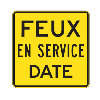 Le panneau « Nouvelle signalisation – Feux en service » (D-40-7) indique un changement dans la régulation de la circulation à un carrefour. Il doit être installé pendant le mois précédant la date de la mise en marche des nouveaux feux de circulation.