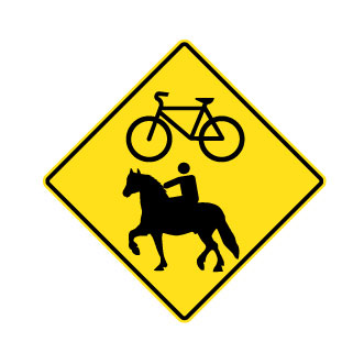 Les panneaux « Passage pour sentier polyvalent » (D-270-18 à D-270-20) indiquent la présence d’un passage pour plusieurs types d’usage, dont les bicyclettes, la motoneige, le quad et l’équitation.