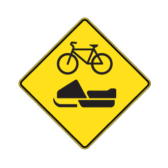 Les panneaux « Passage pour sentier polyvalent » (D-270-18 à D-270-20) indiquent la présence d’un passage pour plusieurs types d’usage, dont les bicyclettes, la motoneige, la motoquad et l’équitation.