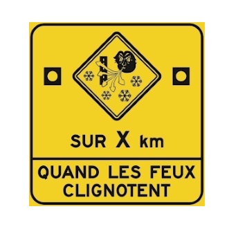 Le panneau « Poudrerie » (D-62-2) indique la présence de neige qui est soulevée et poussée sous l’effet du vent sur un chemin public et qui entraîne une réduction marquée de la visibilité. Il doit être installé lorsque la zone s’étend sur plus de 1 km.