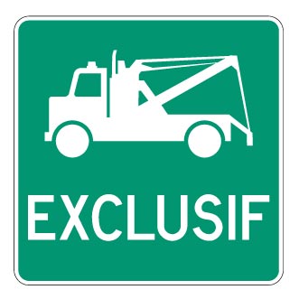 Le panneau « Remorquage exclusif » (I-419-2) indique le début d’une zone où le dépannage et le remorquage par dépanneuse est interdit sauf pour la personne qui a conclu un contrat en vertu de l’article 12.2 de cette loi.
