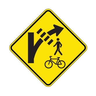 Le panneau « Signal avancé de passage pour piétons et bicyclettes dans un îlot déviateur » (D-270-30) indique la présence d’un passage pour piétons et pour bicyclettes dans une voie de virage munie d’un îlot déviateur.