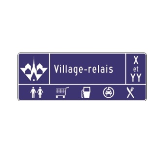 Le panneau « Village-relais » (I-620-1) indique aux usagers de la route une municipalité offrant une diversité de services et une qualité d’accueil afin d’accroître leur sécurité et d’offrir un lieu d’arrêt accessible en tout temps.
