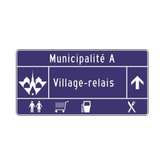 Le panneau « Village-relais » (I-620-2) indique aux usagers de la route une municipalité offrant une diversité de services et une qualité d’accueil afin d’accroître leur sécurité et d’offrir un lieu d’arrêt accessible en tout temps.