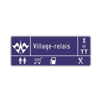 Le panneau « Village-relais » (I-620-1) indique aux usagers de la route une municipalité offrant une diversité de services et une qualité d’accueil afin d’accroître leur sécurité et d’offrir un lieu d’arrêt accessible en tout temps.