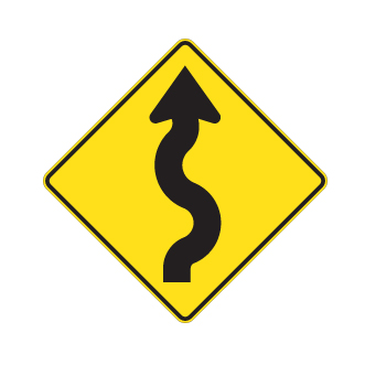 Les panneaux « Virages » (D-110) indiquent la proximité d’une ou de plusieurs courbes sur un chemin public. Le panneau D-110-5-D indique un virage triple débutant vers la droite.