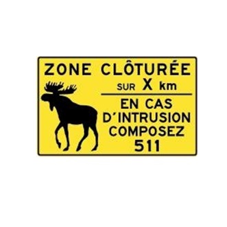 Panneau annonçant le début de la zone clôturée pour les orignaux sur une distance de 1 à 9 km.